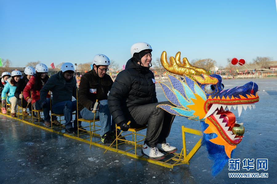 1月21日,参加冰上龙舟赛的人们在什刹海冰场试滑。当日,一场过小年活动在什刹海景区举行,活动包括冰上龙舟、采年货、展非遗等多项内容。 新华社记者李鑫摄
