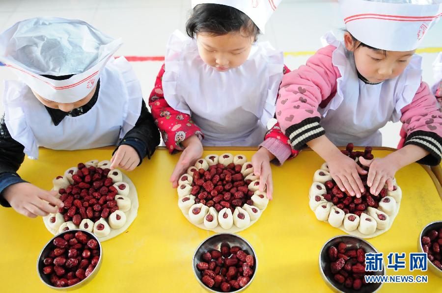 1月21日,山东省聊城市江北水城幼儿园的小朋友们在学做花糕。当日,山东省聊城市江北水城幼儿园举行“做花糕、学民俗”活动,让孩子们动手学做花糕,体验春节民俗文化。山东聊城春节有做花糕的习俗,人们用红枣和面粉制作成一层层的圆塔形的花糕,寓意生活年年高、步步高。新华社发(张振祥 摄)
