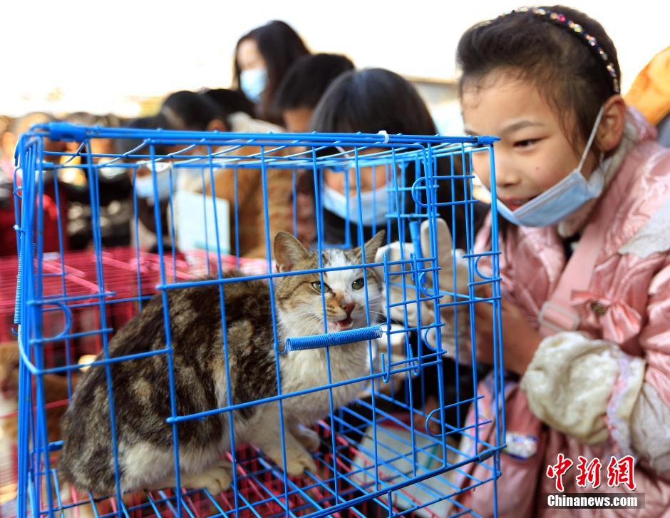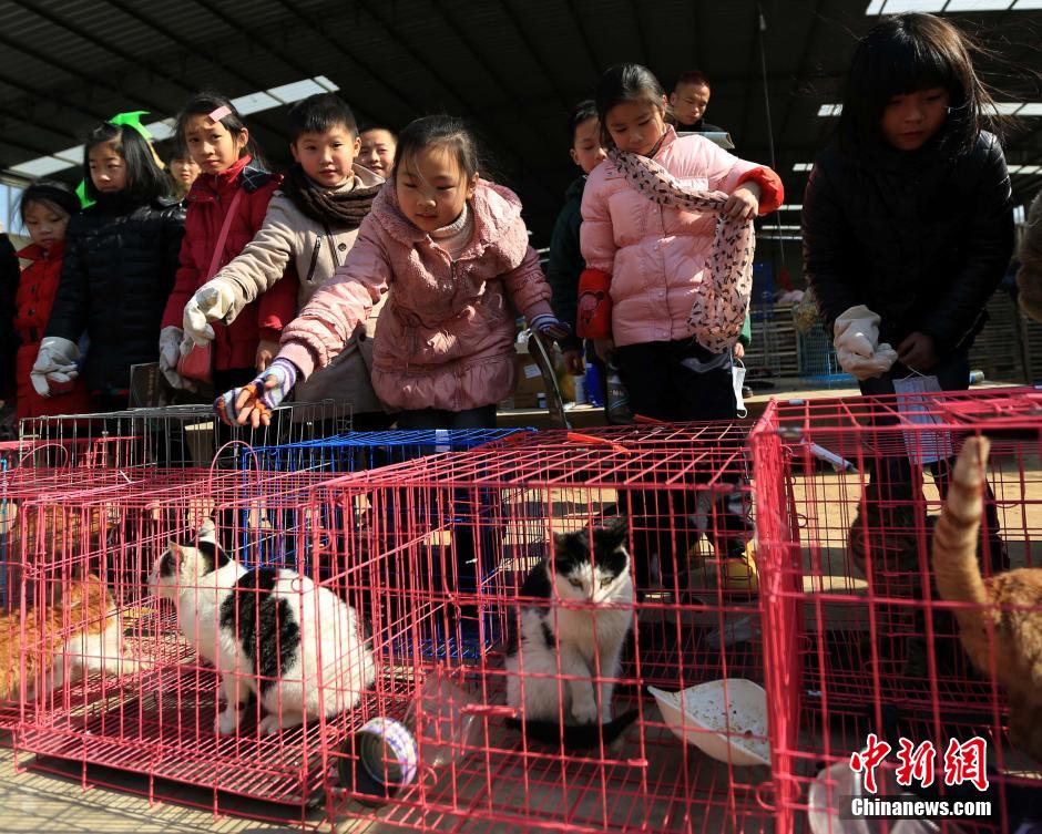 1月21日,来自武汉市大兴路小学24名的小学生来到位于江夏区的李桥村钢材市场,对近日武汉志愿者解救并寄养在此的猫咪进行集中式领养。本月14日,一辆货车欲将2800余只猫从武汉运往南宁,途中遭到志愿者彻夜追踪阻拦,在即将离开湖北境内时,交警将货车拦截,责令其返回武汉接受调查处理。经武汉动检部门调查,猫贩私制假检疫证明,其行为已违法,决定对这批猫咪进行查没处理,并同意由武汉市小动物保护协会妥善安置。中新社发 张畅 摄
