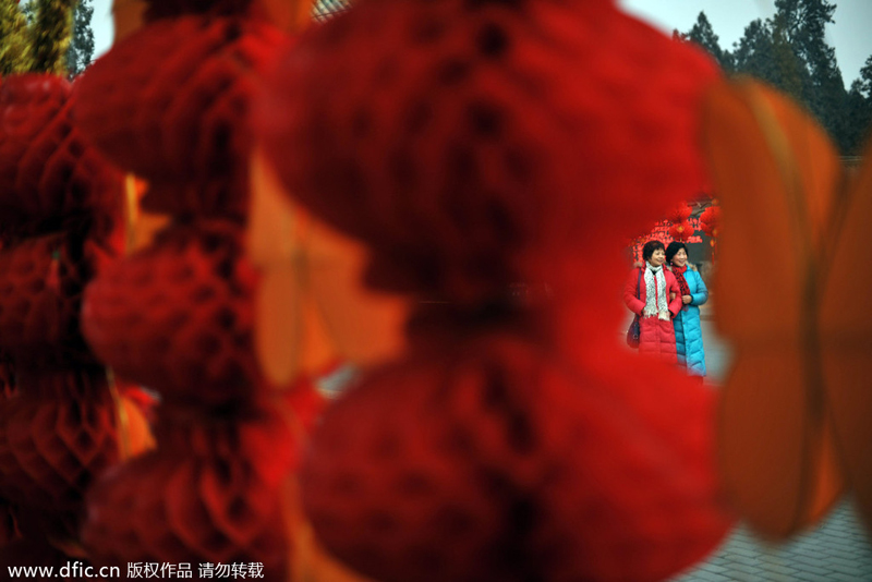 2014年1月23日,北京,农历马年到,第29届地坛春节文化庙会即将到来,北京地坛公园的大树上挂满大红灯笼,中国红扮靓中国年,北京城一片喜气洋洋氛围。