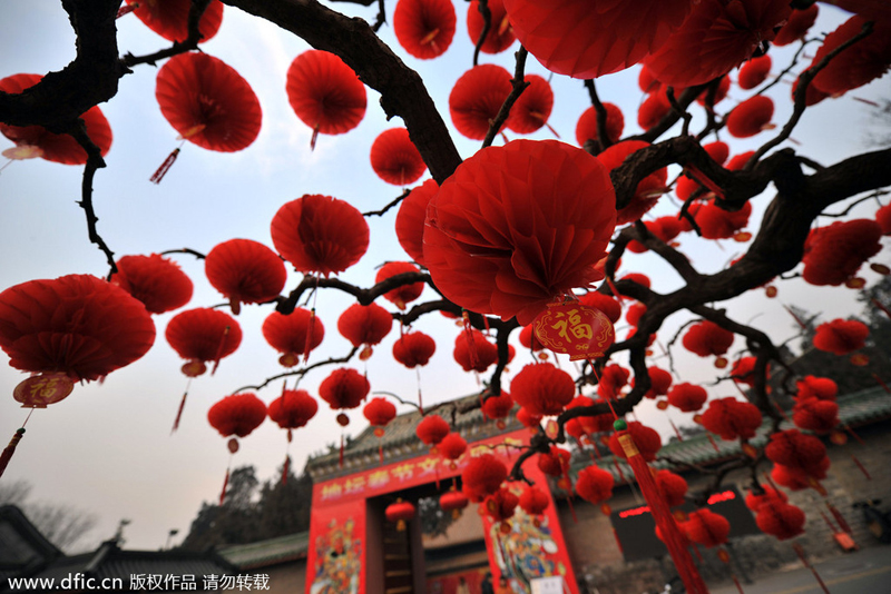 2014年1月23日,北京,农历马年到,第29届地坛春节文化庙会即将到来,北京地坛公园的大树上挂满大红灯笼,中国红扮靓中国年,北京城一片喜气洋洋氛围。