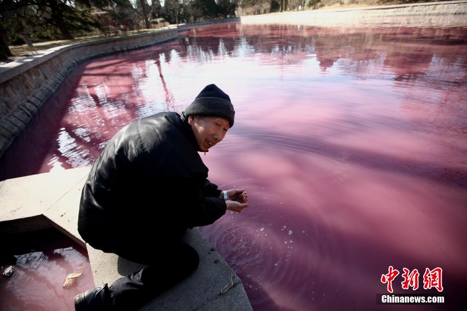 1月27日,青岛八大关景区的人工湖边,工作人员在利用水泵排放湖水。原先清澈透明的湖水如今已变成了暗红色,水面隐约漂浮着一层油渍,还散发出阵阵恶臭气味。据八大关景区的工作人员介绍,湖水变质已有20多天了,青岛市南环保以及市政排水管理处的工作人员都来过现场,也取走水样,但至今也没有找到湖水变红发臭的原因。青岛八大关景区曾被《中国国家地理》评为中国最美五大城区之一。中新社发 徐崇德 摄