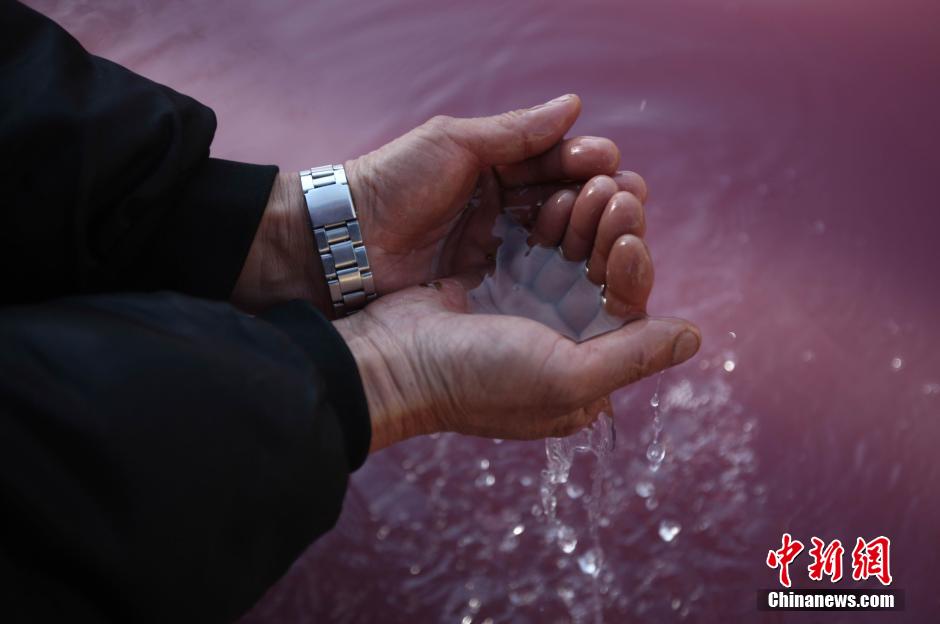 1月27日,青岛八大关景区的人工湖边,工作人员在利用水泵排放湖水。原先清澈透明的湖水如今已变成了暗红色,水面隐约漂浮着一层油渍,还散发出阵阵恶臭气味。中新社发 徐崇德 摄