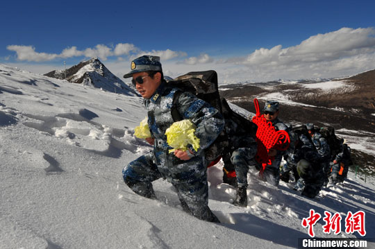 近日,成空雷达某团政委杨寿保和送给养的官兵,踏着齐膝深的积雪,徒步1个小时,将年货送上藏南地区5134米的某雷达站阵地。杨政委和战士一起挂灯笼,贴对联,粘窗花,包饺子,打扑克,银装素裹的雪域军营到处弥漫着浓浓的年味。中新社发 郭超英 摄