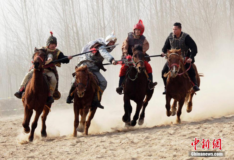 1月28日,农历腊月二十八,马年春节来临,河南郑州商都民俗庙会上,燕人“张飞”挺丈八矛,“云长”舞八十二斤青龙偃月刀,“刘备”掣双股剑,骤黄骠马,与持方天画戟的猛将“吕布”交战在一起,并配有《三国演义》中“三英战吕布”的经典音乐,令人身临其境,描绘了一场现实版酣畅淋漓的沙场血拼。中新社发 王中举 摄