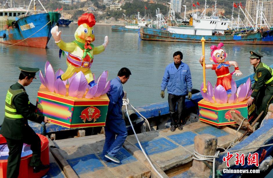 1月28日,福州连江黄岐边防派出所官兵协助工作人员将赠送马祖的花灯搬运装船。当日,装载赠送马祖乡亲的1029盏花灯的马祖建騵号货船带着新春祝福,驶离福州连江县黄岐台轮停泊点码头,启运马祖。今年,在第12届“两马同春闹元宵”的活动中,福州马尾区定制并赠送马祖同胞款式多样的走马灯,八骏图、马年特制花灯、妈祖女神灯、新春喜庆灯等1029盏花灯,贺新春送祝福。中新社发 刘可耕 摄