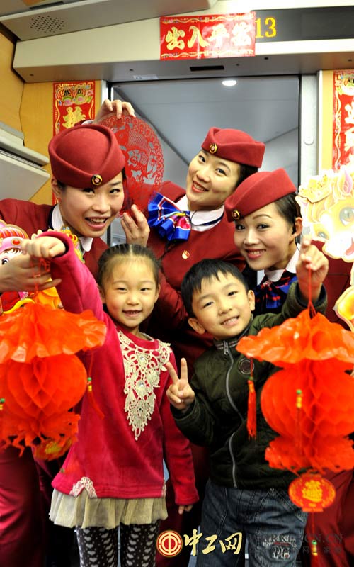 1月29日,南昌至义乌D640次列车上,窗花、灯笼、对联和马年吉祥物把车厢装扮的一派喜庆洋洋,红红火火。在新春佳节来临之际,美丽动姐和孩子们欢天喜地庆祝马年到来,并为返家旅客送上温馨祝福。爱的旅途,下一站就是幸福。