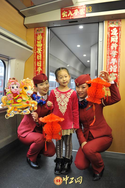 1月29日,南昌至义乌D640次列车上,窗花、灯笼、对联和马年吉祥物把车厢装扮的一派喜庆洋洋,红红火火。在新春佳节来临之际,美丽动姐和孩子们欢天喜地庆祝马年到来,并为返家旅客送上温馨祝福。爱的旅途,下一站就是幸福。