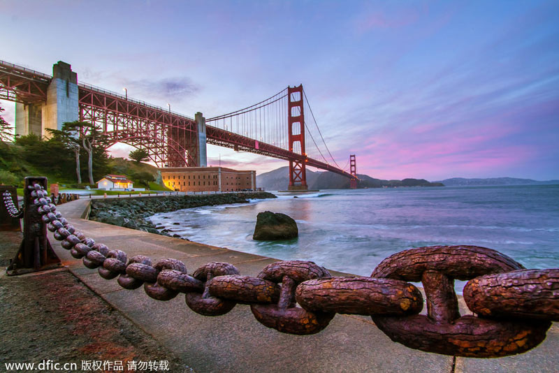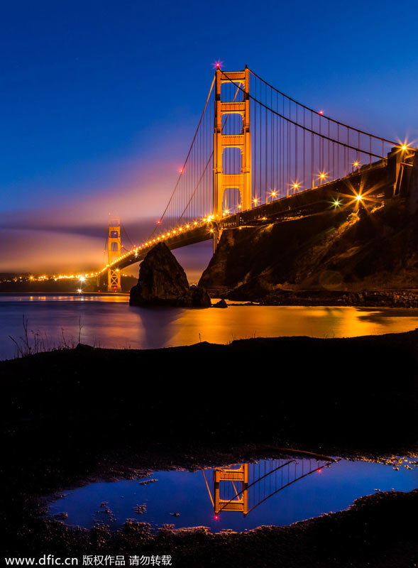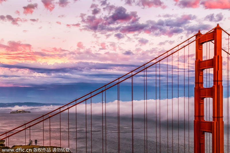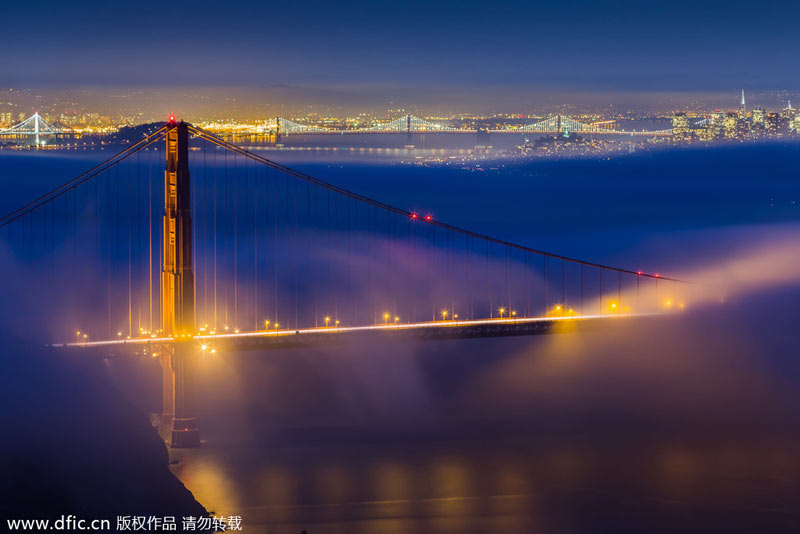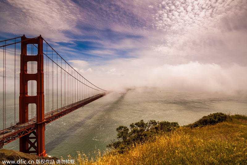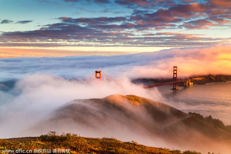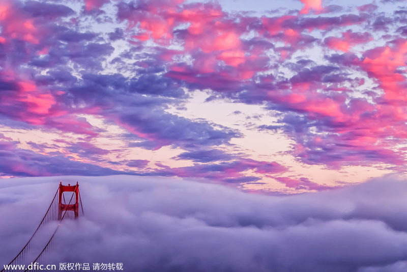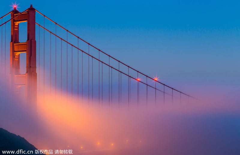2014年1月29日报道,美国旧金山,34岁的摄影师Dave Gordon本来是准备拍摄日落美景的,正好碰上大雾慢慢地笼罩金门大桥,瞬间就被眼前这仙境般的美景所震撼,拿起相机拍下了这一梦幻景象。