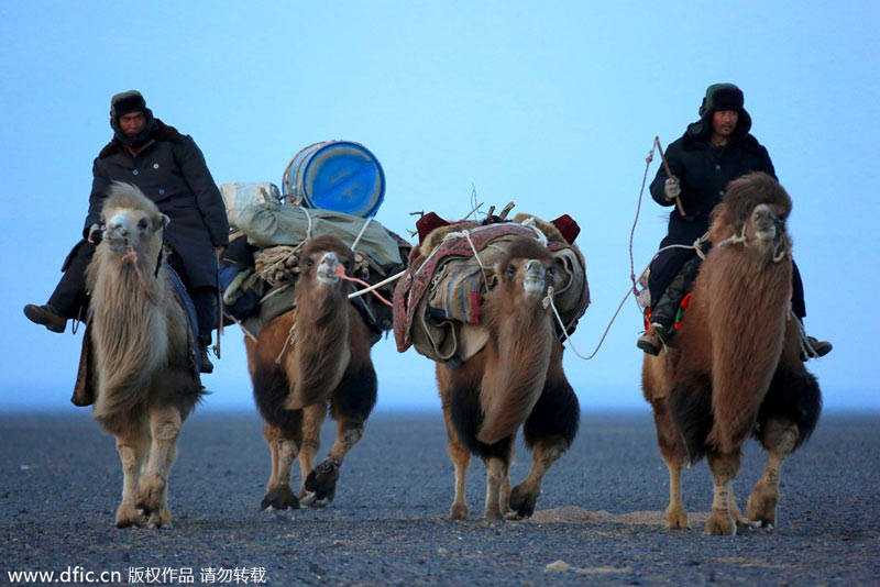 2014年1月27日,随着气温的逐渐升高,新疆哈密北部牧民转场工作陆续展开,今年牧民转场工作较往年有所提前提前。新疆巴里坤哈萨克自治县三塘湖的戈壁上牧民骑着骆驼转场。