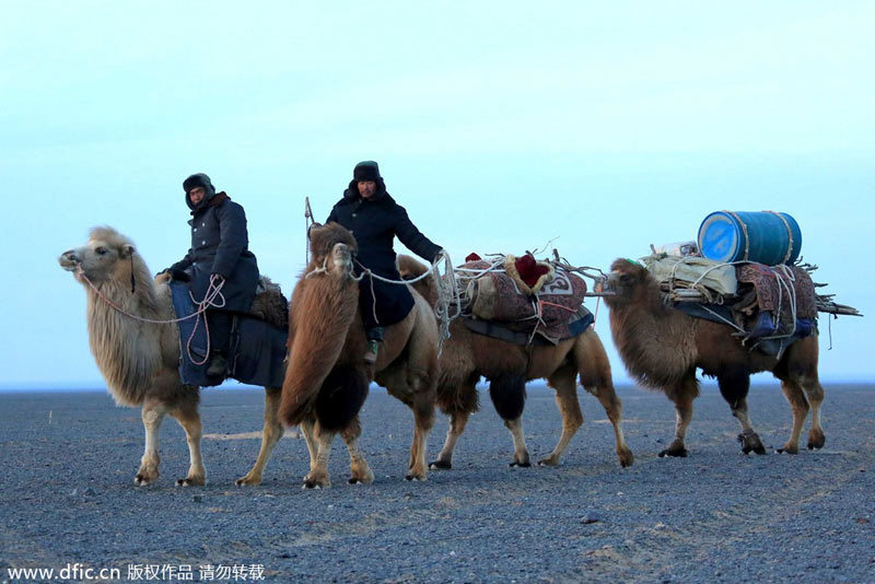 2014年1月27日,随着气温的逐渐升高,新疆哈密北部牧民转场工作陆续展开,今年牧民转场工作较往年有所提前提前。新疆巴里坤哈萨克自治县三塘湖的戈壁上牧民骑着骆驼转场。