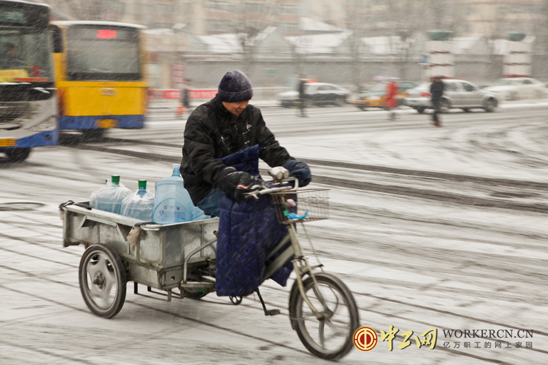2月7日凌晨,京城上空飘起了雪花,北京迎来了马年首场降雪,不过,今天正是春节假期后的第一个工作日,所以这场降雪也给市民出行带来不便。据悉,今天白天降雪仍将持续。图为在雪中行进的送水工。中工网记者韩靖摄