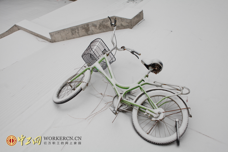 2月7日凌晨,京城上空飘起了雪花,北京迎来了马年首场降雪,不过,今天正是春节假期后的第一个工作日,所以这场降雪也给市民出行带来不便。据悉,今天白天降雪仍将持续。图为雪地里的自行车。中工网记者韩靖摄