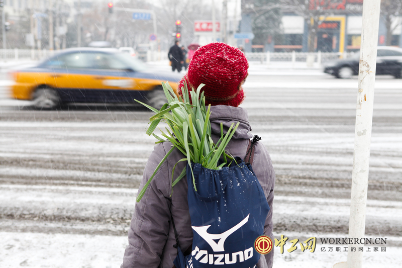 2月7日凌晨,京城上空飘起了雪花,北京迎来了马年首场降雪,不过,今天正是春节假期后的第一个工作日,所以这场降雪也给市民出行带来不便。据悉,今天白天降雪仍将持续。图为早晨出来买菜的市民准备过马路。中工网记者韩靖摄