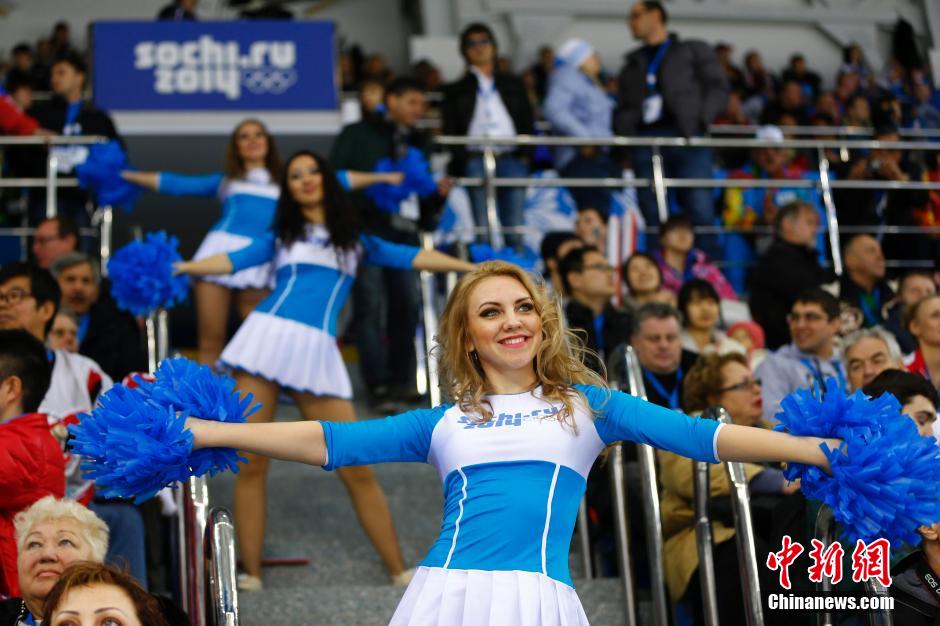 当地时间2月9日,美女拉拉队在索契冬奥会女子冰球小组赛中为现场助兴。中新社发 富田 摄