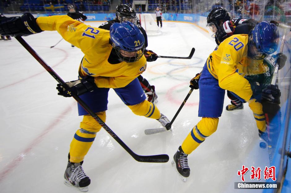 当地时间2月9日,索契冬奥会女子冰球小组赛第二日比赛在Shayba冰球中心继续进行,瑞典队(黄)以1:0战胜日本队。中新社发 富田 摄