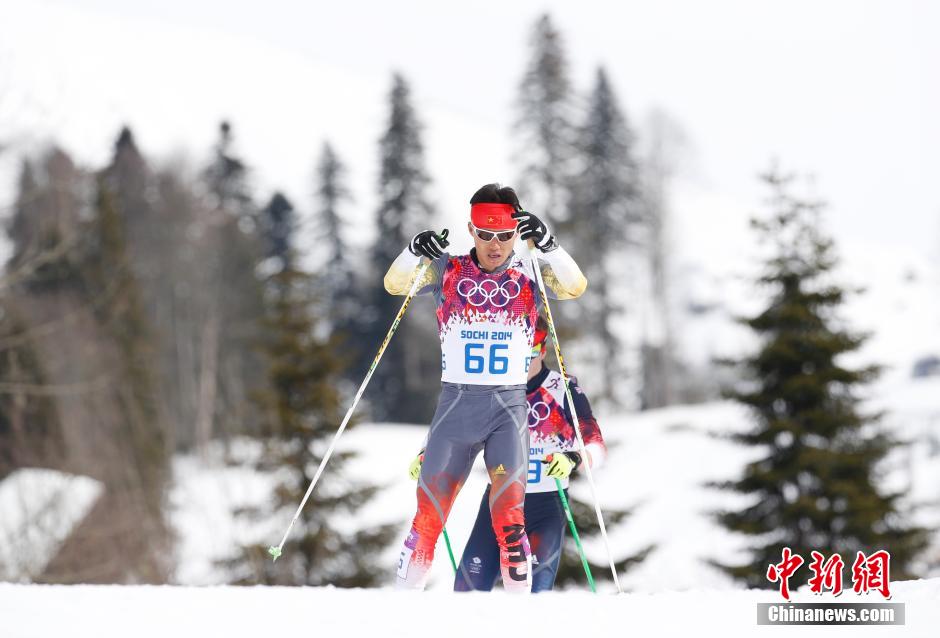 当地时间2月9日,在索契冬奥会越野滑雪男子30公里追逐赛中,中国选手许文龙以1小时16分53秒3的成绩排名第59位。中新社发 刘关关 摄