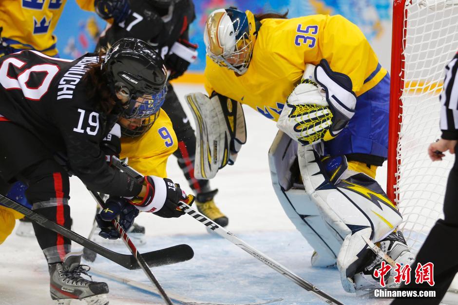 当地时间2月9日,索契冬奥会女子冰球小组赛第二日比赛在Shayba冰球中心继续进行,瑞典队(黄)以1:0战胜日本队。中新社发 富田 摄