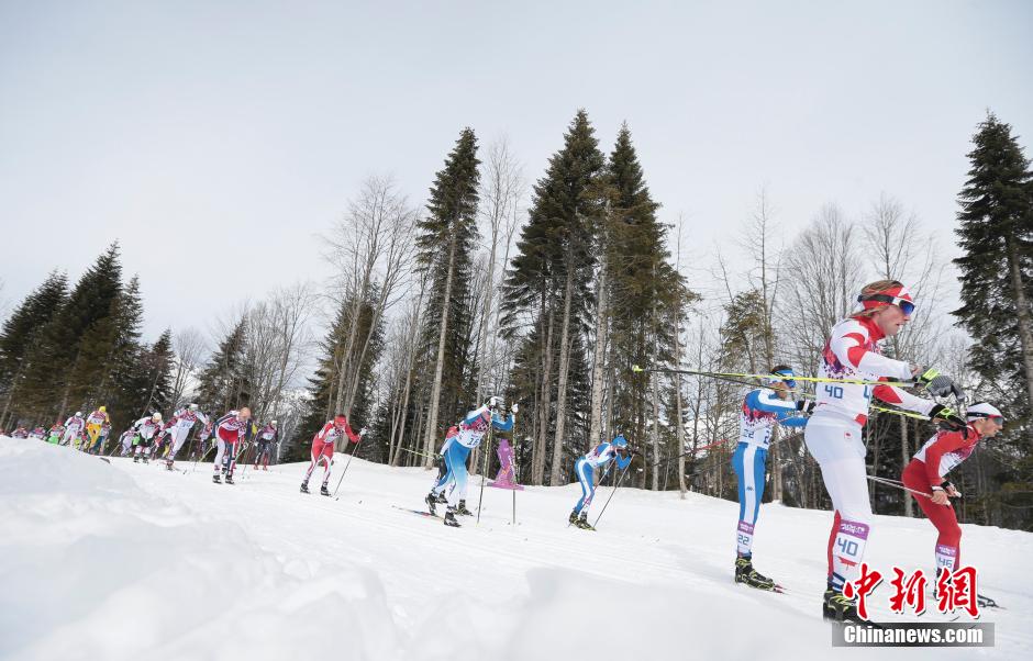当地时间2月9日,在索契冬奥会越野滑雪男子30公里追逐赛中,选手们在“林海雪原”间你追我赶。中新社发 刘关关 摄