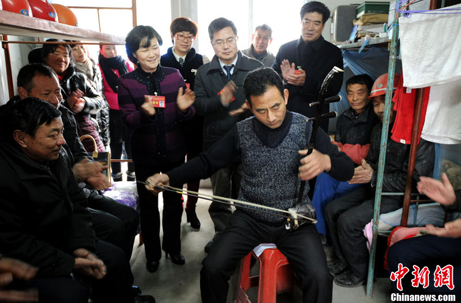 2月9日,安徽,参加安徽省两会的政协委员们走进工棚,与农民工们交流谈心。图为众多农民工朋友们齐聚工棚内,为委员们演唱了《喜洋洋》等歌曲。项春雷 摄 图片来源:CFP视觉中国