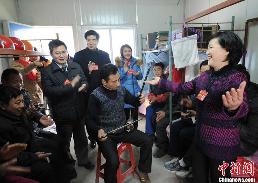 2月9日,安徽,参加安徽省两会的政协委员们走进工棚,与农民工们交流谈心。图为朱平委员在现场与农民工朋友合作,演唱了一首《洪湖水,浪打浪》。项春雷 摄 图片来源:CFP视觉中国