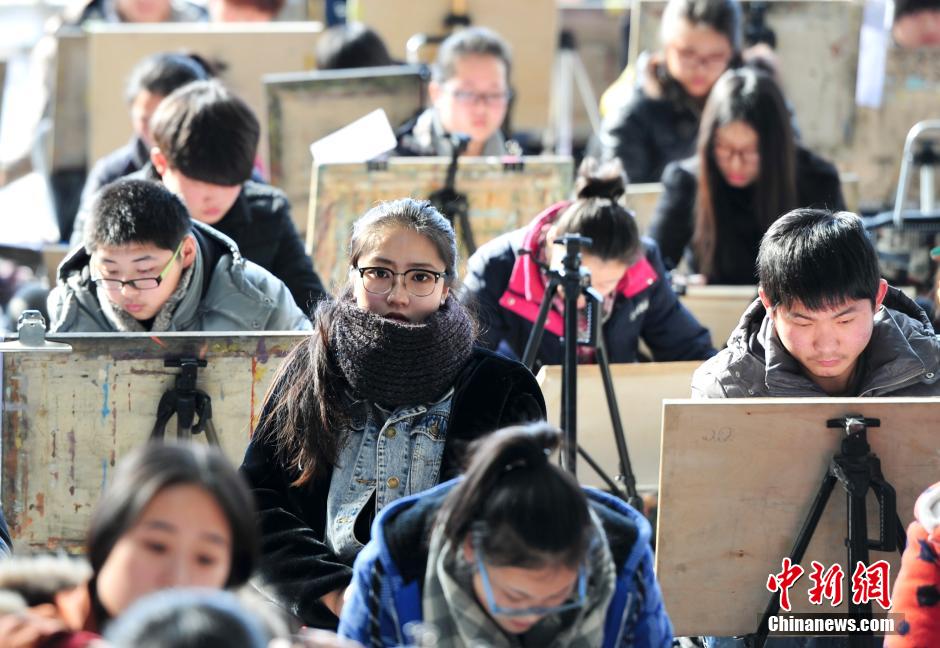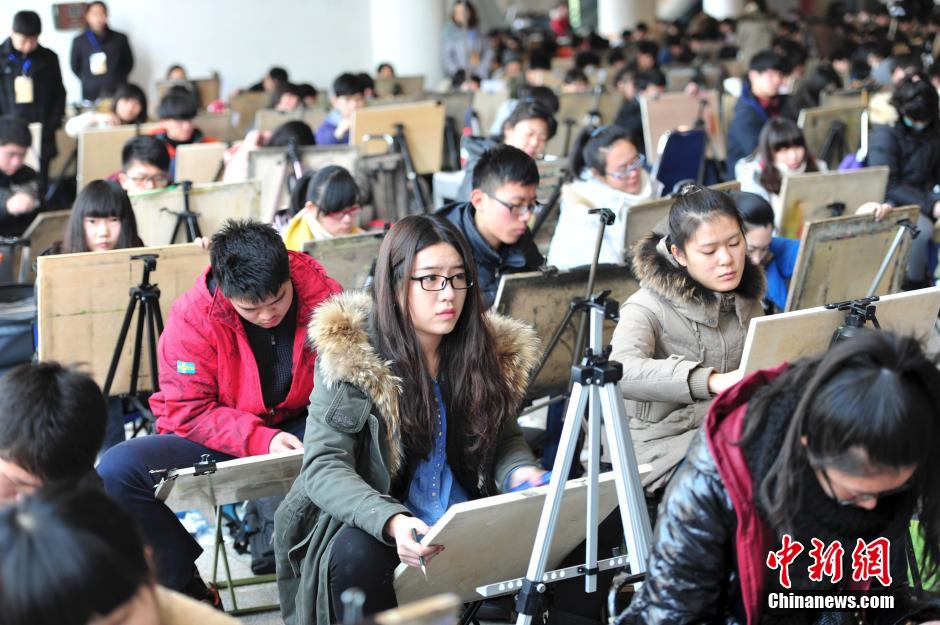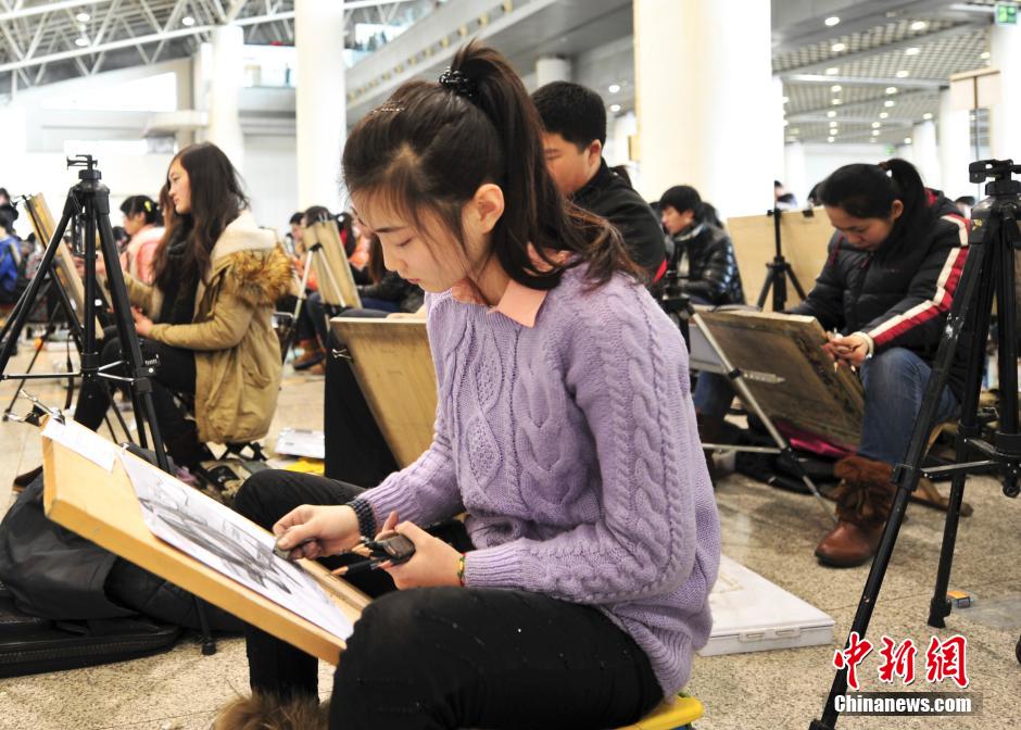 2月10日,山东工艺美术学院艺术生招考首日,8000艺考生在济南舜耕国际会展中心同场竞技,画书包“圆梦”大学。中新社发 张勇 摄
