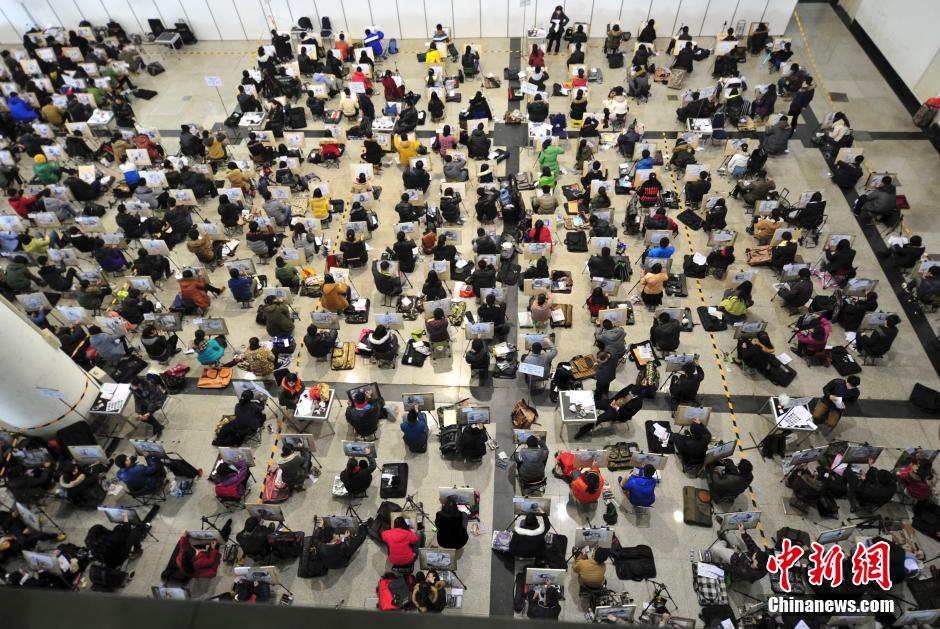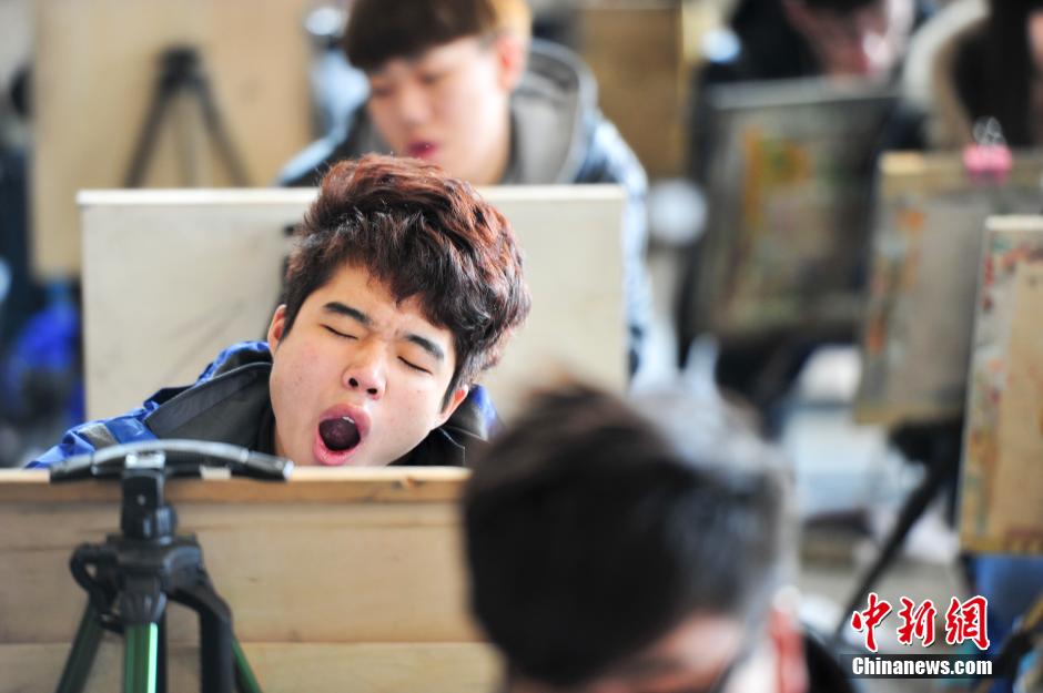 2月10日,山东工艺美术学院艺术生招考首日,8000艺考生在济南舜耕国际会展中心同场竞技,画书包“圆梦”大学。图为转场应考让艺考生疲惫不堪。中新社发 张勇 摄