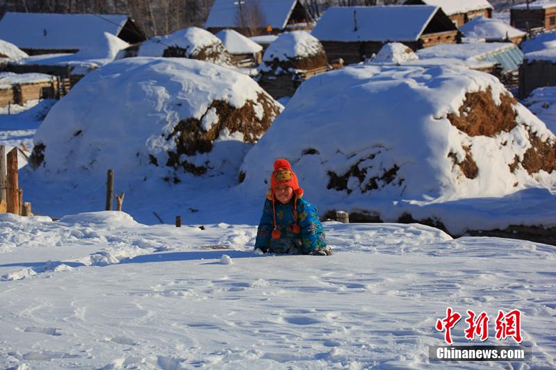 地处新疆阿勒泰地区哈巴河县城以北80公里处深山里的齐巴契列克村,约400人,均为哈萨克族居民。他们牧牛放马,早出晚归,民风淳朴,其房屋全部是结构独特别致的木屋。冬天,白雪覆盖,整个村落美如山水画。图为村中的小女孩正在玩雪。刘是何 摄