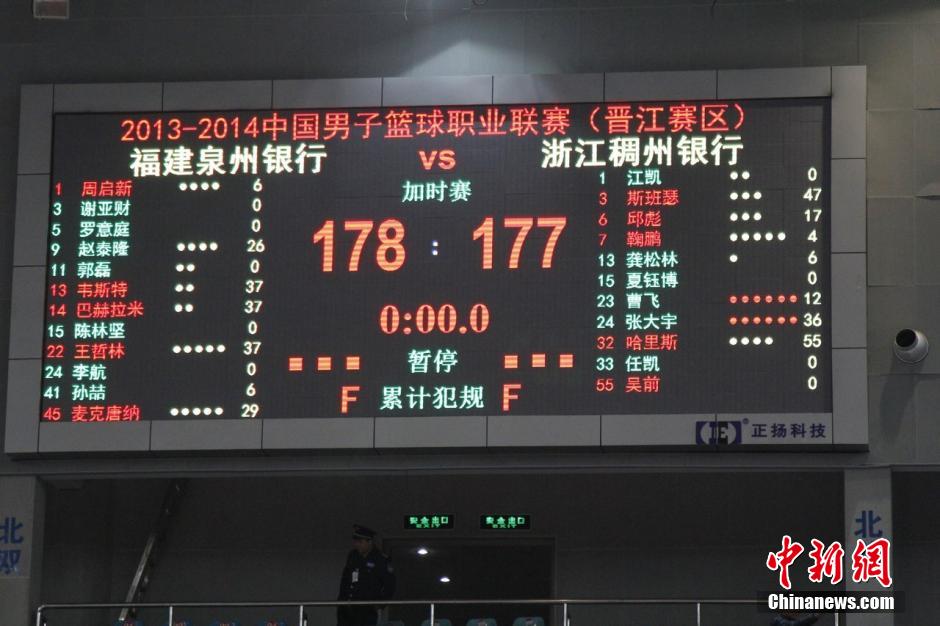 2014年2月9日,CBA联赛第31轮,福建队主场苦战5加时以178-177战胜浙江队,结束四连败。本场比赛创造了CBA单场总得分355分的纪录,福建队的178分打破CBA单场单队得分纪录。韦斯特35分全队最高11助攻;王哲林37分13篮板;巴赫拉米37分11助攻;麦克唐纳29分18篮板;赵泰隆26分三分球10投6中。哈里斯55分17篮板;张大宇36分16篮板;斯班瑟47分13篮板9助攻;邱彪17分9篮板;曹飞12分7助攻。图片来源:Osports全体育图片社