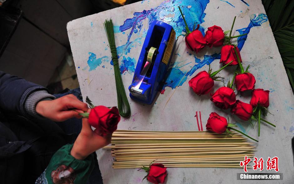 2月10日,随着情人节的临近,辽宁省沈阳市各花店的鲜花预定业务也开始火爆起来,不少花店为了按时完成情人节当天的订单,已开始加班加点赶制花束。据了解,今年鲜花市场价格普涨,其中玫瑰花受情人节和产地云南雨雪天气影响,价格将上涨。情人节沈阳玫瑰花价格翻番与南方降雪运输困难有关。中新社发 于海洋 摄