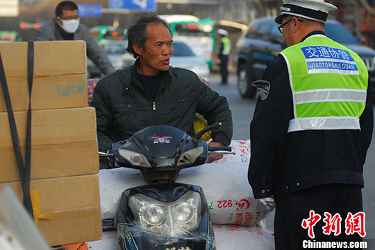 2月11日,交警拦下一超载电动车辆。从2月10日起,昆明市公安局开展为期11个月的电动车集中整治行动,电动车的各类交通违法行为是整治重点之一。中新社发 蒋卓成 摄