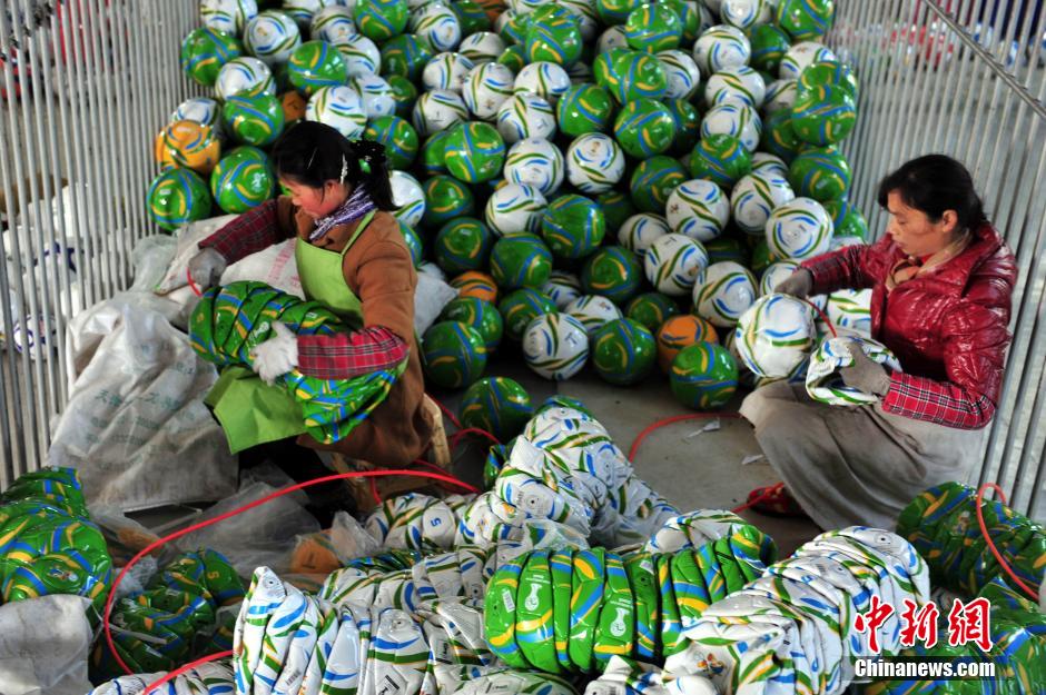 近日,位于江西省南昌市进贤经济开发区的黑马体育用品公司的工人正在加紧生产2014年巴西世界杯足球赛的纪念用球和礼品用球。据了解,从去年10月份开始,该公司就开始设计、生产出口欧美的世界杯专用足球,日生产量达30000多只,保质保量完成出口订单,为2014年世界杯足球赛添彩。中新社发 万朝晖 摄