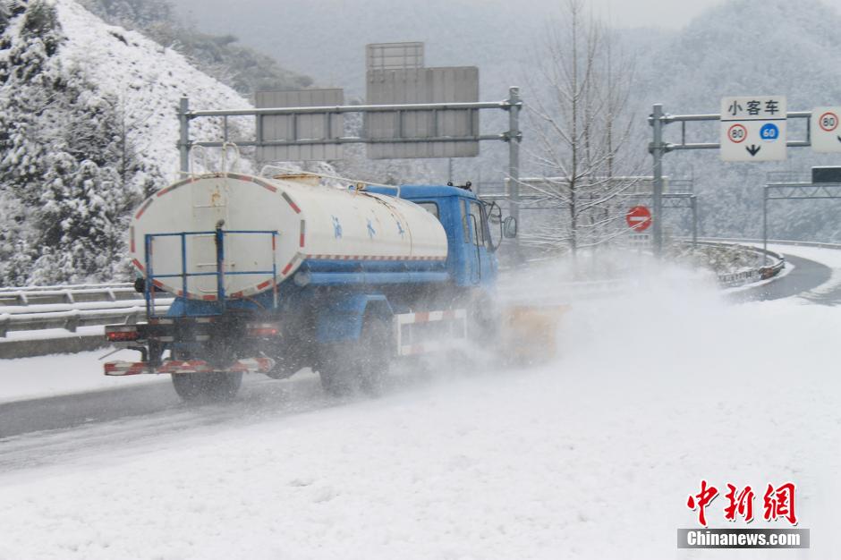 2月13日,受降雪影响,浙江诸永高速公路积雪严重,路面几乎被雪全覆盖。当天,诸永高速积雪最深处达到20公分,导致车辆通行受阻。预计当晚浙江多条高速的山区路面和桥梁路段仍可能会出现积雪。中新社发 李巍 摄