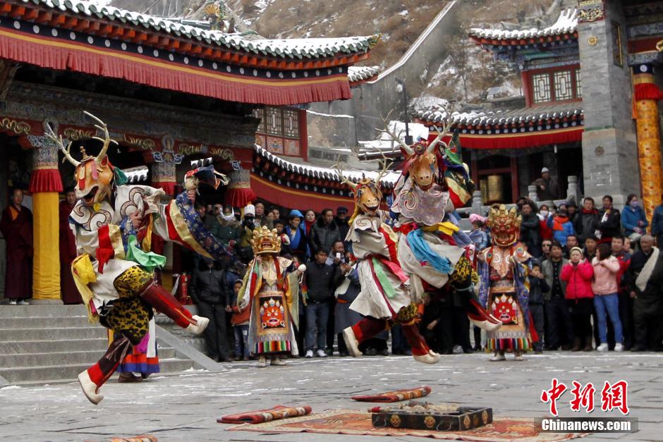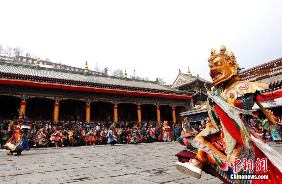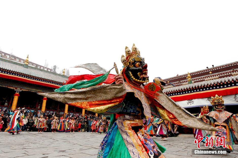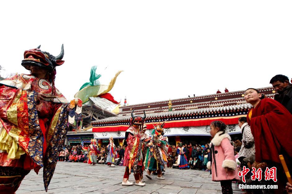 2月13日,头戴面具的年轻僧人“跳神”。当日,藏传佛教格鲁派创始人宗喀巴大师的诞生地——青海省西宁市湟中县塔尔寺举行“跳欠”仪式。“跳欠”俗称“跳神”,是一种重要的宗教仪式。僧人头戴面具,身着色彩艳丽的服饰,用手势和动作表达各种佛教寓意,并由僧人用舞钹、唢呐等伴奏。中新社发 胡友军 摄