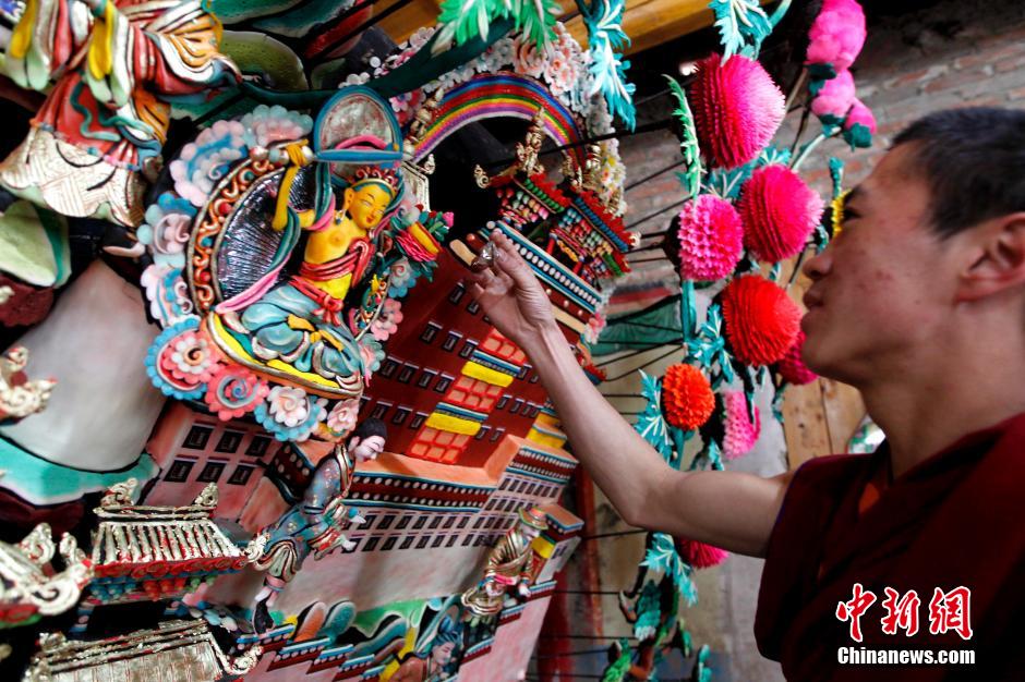 2月13日,青海塔尔寺上花院艺僧尼玛对完成的酥油花进行最后的精修。农历正月十五为藏历上元月,藏传佛教圣地塔尔寺将迎来一年一度的酥油花展。地处青海省西宁市湟中县鲁沙尔镇的塔尔寺是藏传佛教格鲁派创始人宗喀巴的诞生地,其中的壁画、堆绣与酥油花被称为塔尔寺“艺术三绝”,目前塔尔寺酥油花制作分上、下两个花院。由于酥油制作时艺僧们的双手必须长间浸泡在冰水中,因此酥油花被誉为“指尖上绽放的虔诚”。中新社发 胡友军 摄
