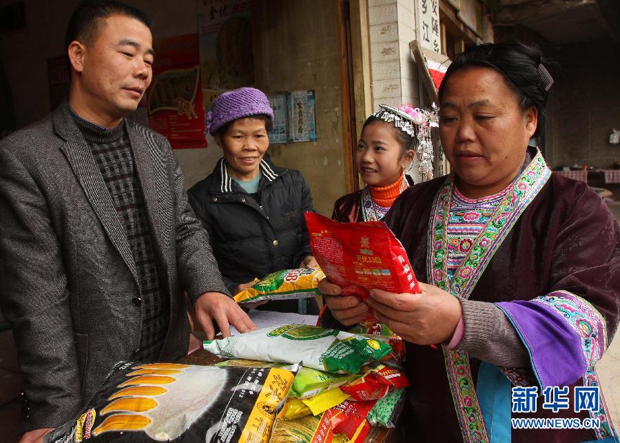 2月16日,在广西融水县安陲乡安陲街,苗族妇女贾家迷(右)在选购谷种。