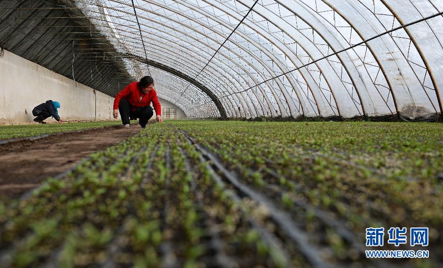 宁夏彭阳县蔬菜育苗中心工作人员为蔬菜苗除草(2月18日摄)。