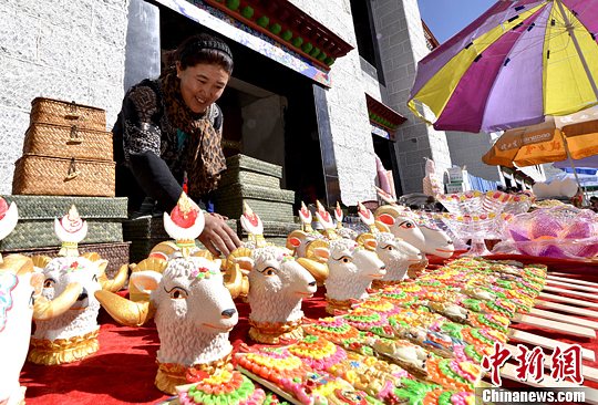 2月19日,商家把藏历年期间每家必备的羊头装饰品码放在货架上。羊头装饰品,藏语称“隆过”,在藏历新年期间会摆放在佛龛前,象征着来年牧业丰收。随着3月上旬藏历木马年的日益临近,拉萨街头年味正浓。中新社发 李林 摄