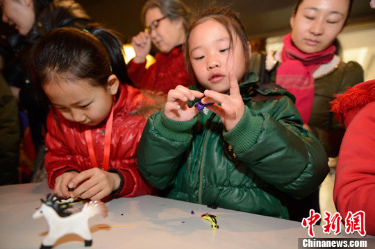2月23日,小学生用软陶制作马。当日,内蒙古博物院邀请了四十余位小学生进行软陶制作、与“马”相关的知识问答和手绘马鞍活动。中新社发 刘文华 摄
