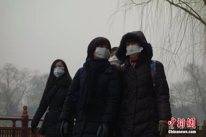 2月24日,游客在北京后海戴着防护口罩游览后海。北京遭遇连续雾霾天气,持续数日未散。中新社发 杜洋 摄