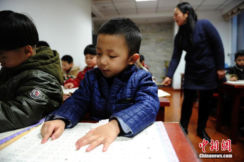2月24日,小朋友在小筛子义学私塾里诵读经典。在安徽合肥梅山路社区有一家名为小筛子义学私塾的国学公益机构,10年来,在这所免费教学的私塾里,累计有5000余名儿童通过诵读经典,学习传统礼仪知识,接受中国传统文化熏陶。中新社发 张娅子 摄
