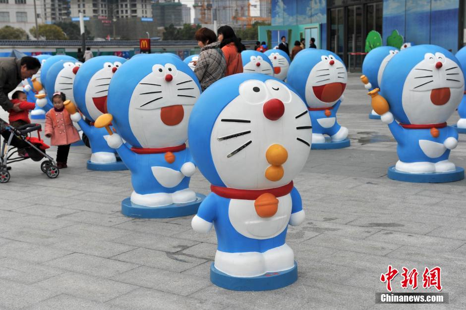 3月3日,20多个各式各样的哆啦A梦模型亮相福州街头,吸引许多路人。中新社发 吕明 摄