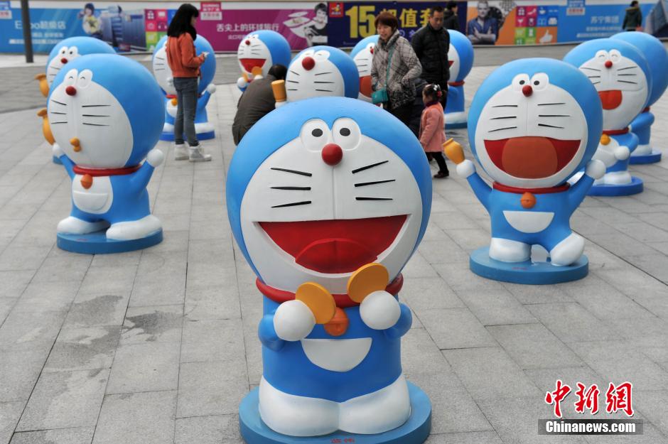 3月3日,20多个各式各样的哆啦A梦模型亮相福州街头,吸引许多路人。中新社发 吕明 摄