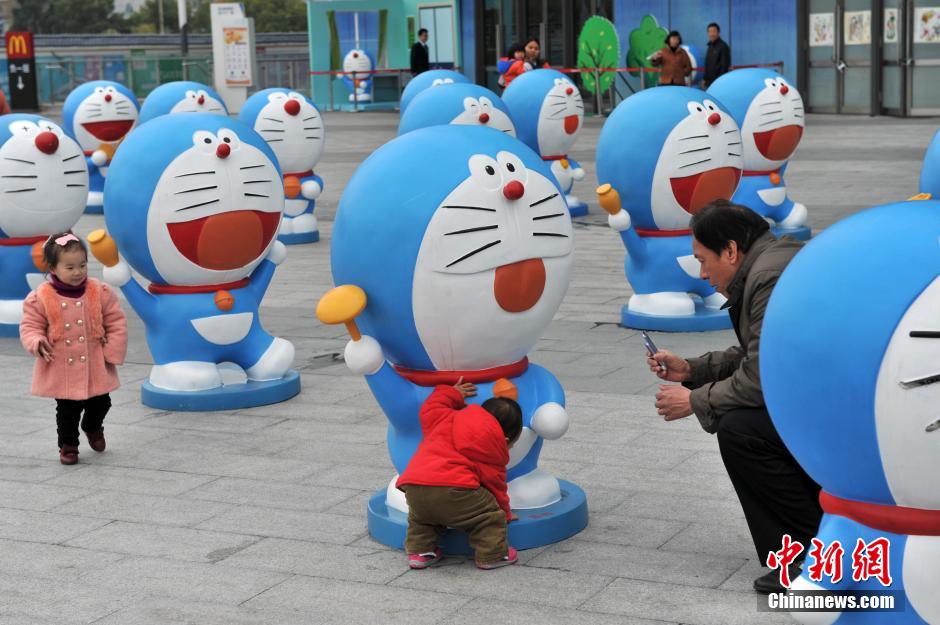 3月3日,20多个各式各样的哆啦A梦模型亮相福州街头,吸引许多路人。中新社发 吕明 摄