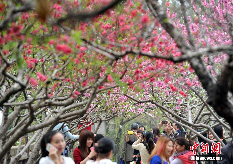 3月1日,游人在桃花映衬下的福州西湖公园划船。春日的福州西湖公园桃花绽放枝头,给榕城增添浓浓的春意,如同一幅美丽的画卷。中新社发 张斌 摄