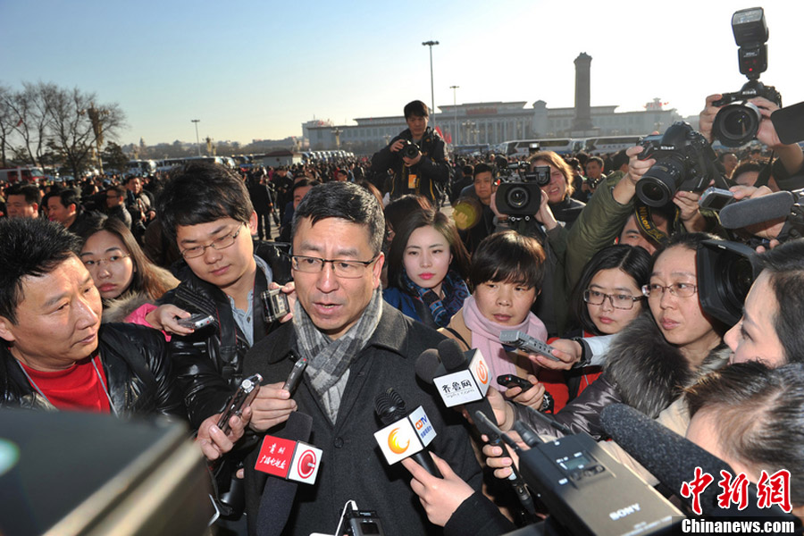 3月5日,北京,人大代表白岩松被媒体记者围个水泄不通。图片来源:东方IC