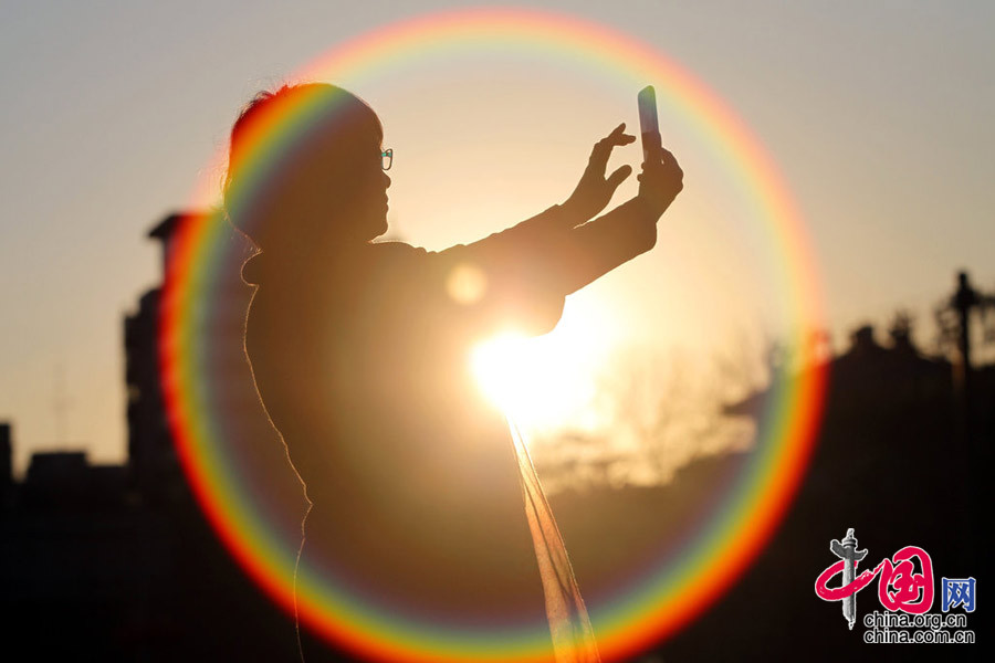 2014年3月5日,北京,众多中外游客观看天安门广场升旗仪式。游客迎着朝阳自拍留影。 当日上午第十二届全国人民代表大会第二次会议在人民大会堂开幕,听取国务院总理李克强作政府工作报告,审查计划报告和预算报告。图片来源:中国网
