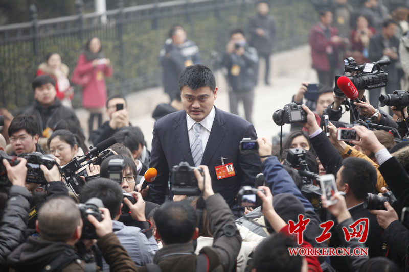 2014年全国“两会”正在北京召开,作为身高最高的政协委员姚明成为媒体“围攻”的焦点,无论姚明委员走到哪,身边总有大批记者跟随。图为全国政协十二届二次会议开幕会前,政协委员姚明走入人民大会堂。中工网记者韩靖摄