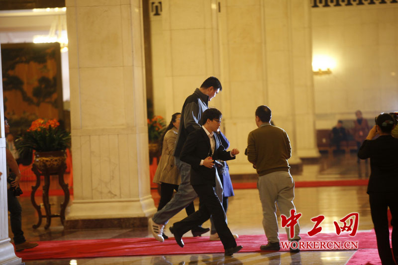 2014年全国“两会”正在北京召开,作为身高最高的政协委员姚明成为媒体“围攻”的焦点,无论姚明委员走到哪,身边总有大批记者跟随。图为全国政协十二届二次会议第三次全体会上,姚明委员最后入场。中工网记者韩靖摄