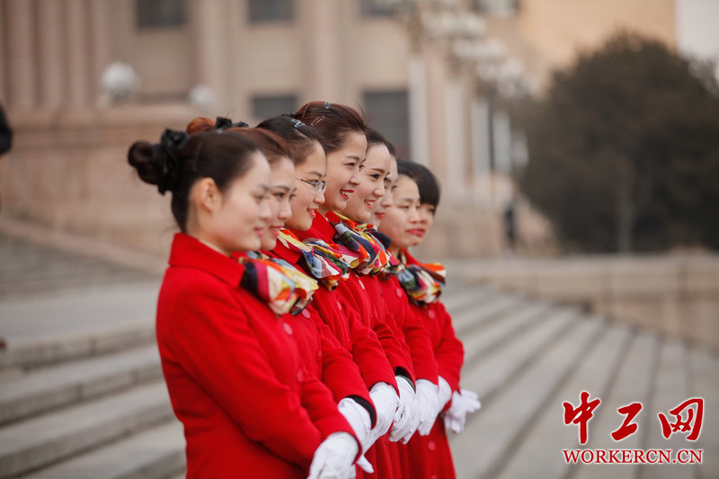 3月10日,十二届全国人大二次会议在北京人民大会堂举行第三次全体会议。会议开始后,在人民大会堂东门台阶上,参与大会服务的引导员们合影留念。中工网记者韩靖摄